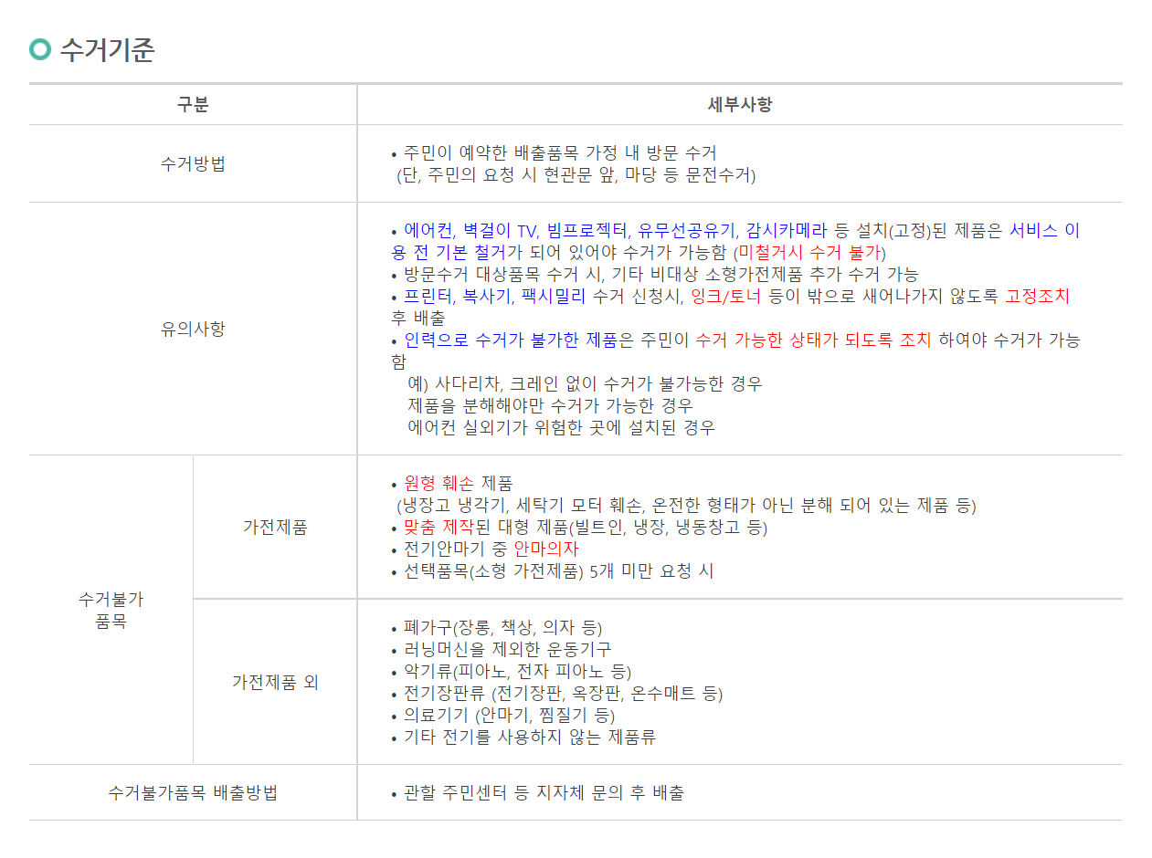 폐가전제품 무상방문수거 수거 기준입니다. 수거불가 품목도 있으니, 잘 확인하셔서 예약 신청하세요.
