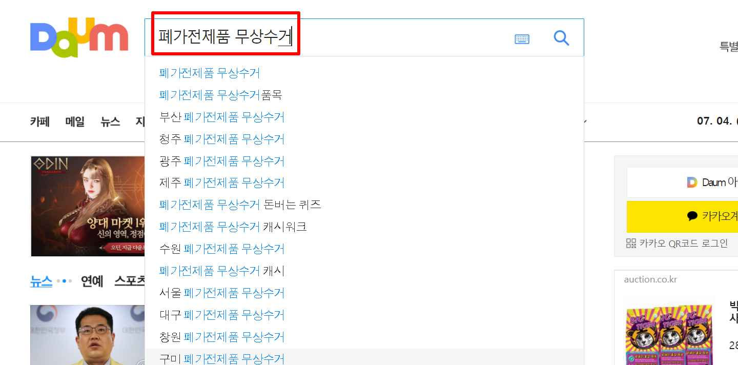 1. 다음(daum) 검색창에 "폐가전제품 무상수거" 또는 "폐가전 배출예약시스템"을 검색합니다.