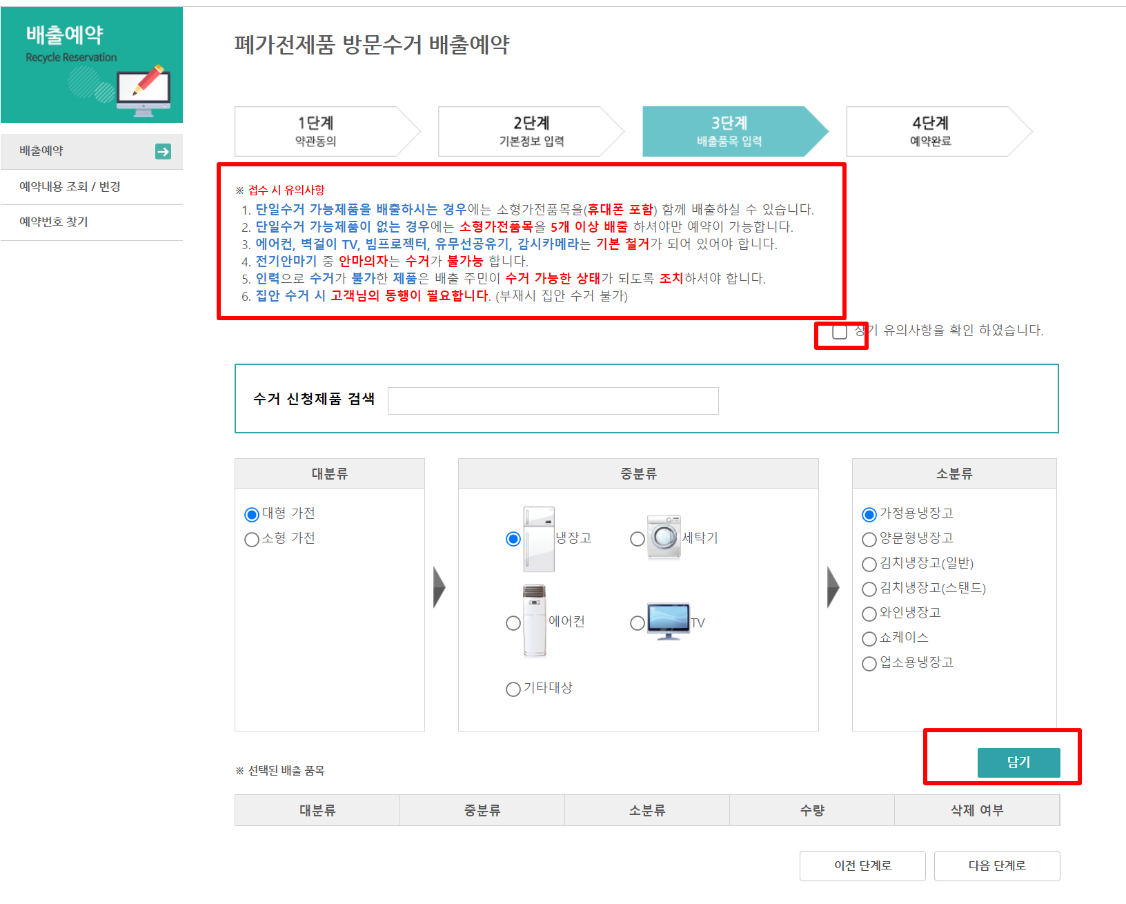5. 접수 시 유의사항이 나오는데요. 잘 읽어보시고, 혹여나 해당되지 않는 제품이 있을 수 있으니, 꼭 숙지하셔야 합니다. 수거하실 제품을 선택하셔서 담기를 하시고 다음 단계로 넘어갑니다.