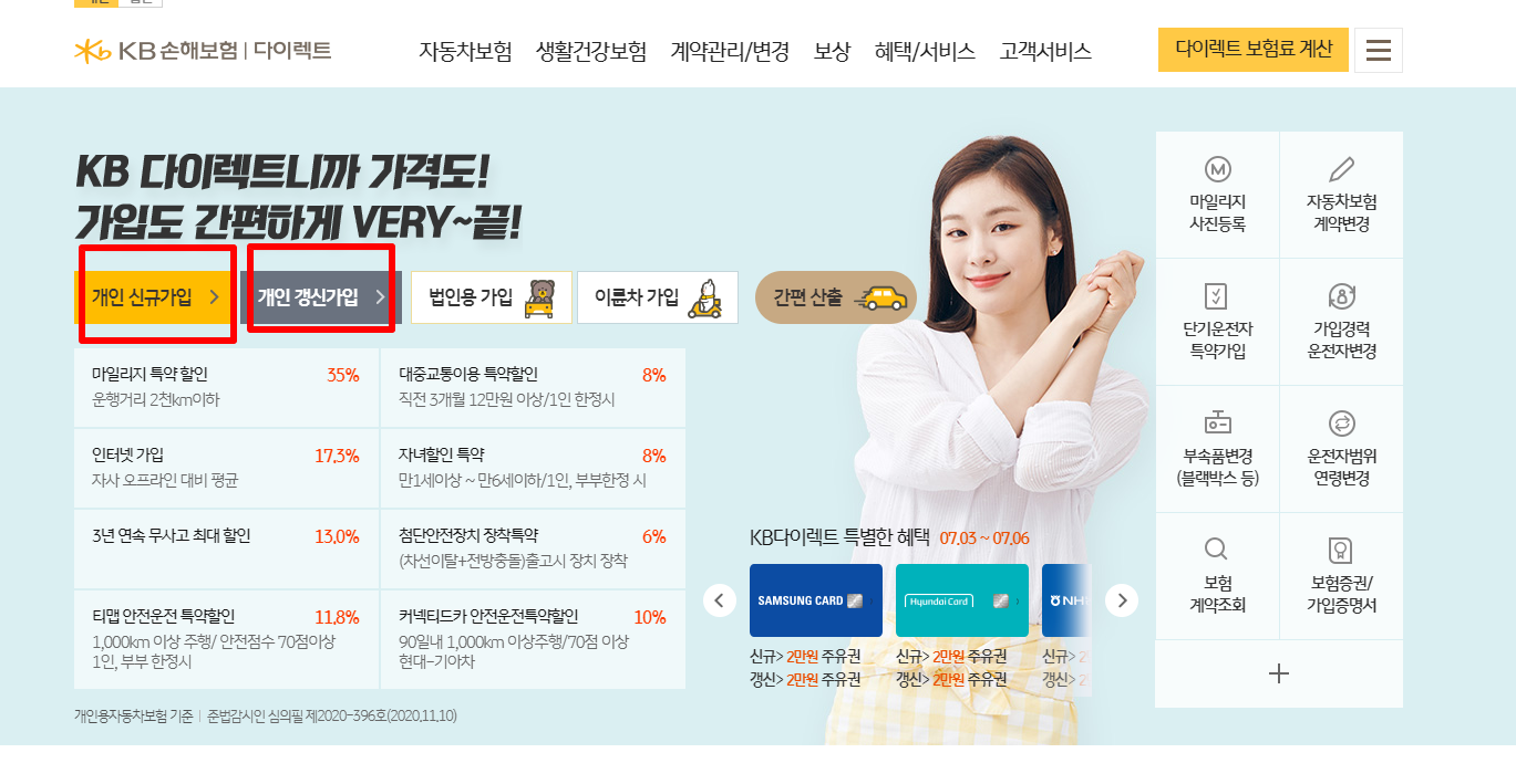 kb손해보장 다이렉트 자동차보험 홈페이지에 접속하시면 "개인 신규가입" "개인 갱신 가입" 누르셔서 가입하시면 됩니다.