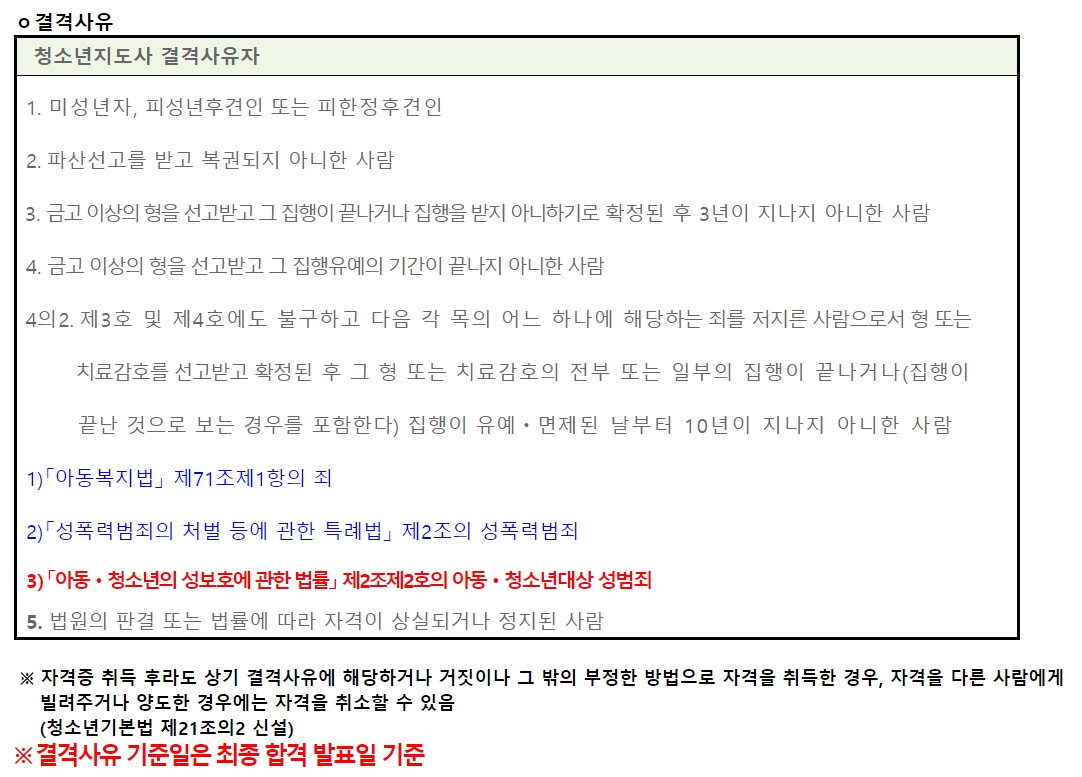 청소년지도사 시험 결격사유는 아래와 같다.