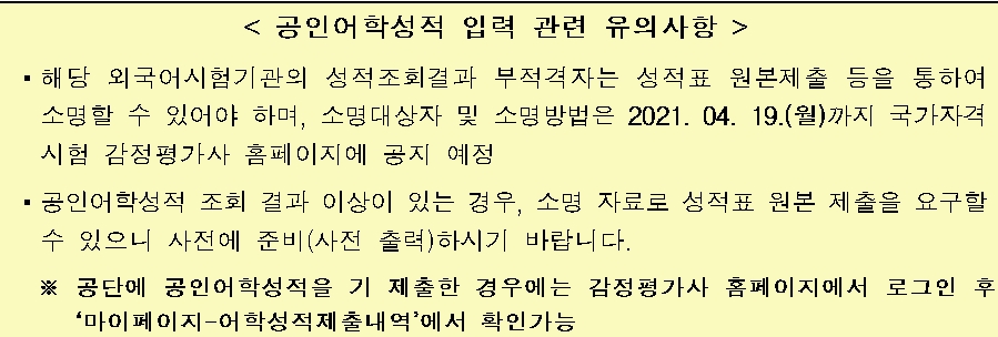 - 공인어학성적의 위. 변조 또는 부당한 목적으로 영어성적을 허위 입력한 경우, 해당 시험은 무효 처리되며, 감정평가 및 감정평가사에 관련 법률 제16조에 따라 5년간 응시자격이 정지될 수 있음.