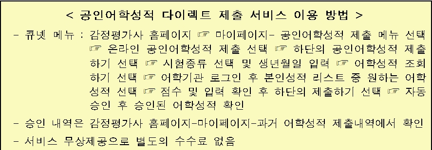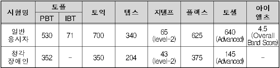 ○ 해당 외국어 시험기간의 정기시험 성적만 인정하고, 정부기관, 민간회사, 학교 등에서 승진, 연수, 입사, 입학, 졸업 등의 특정 목적으로 실시하는 수시 또는 특별시함은 인정하지 않음.