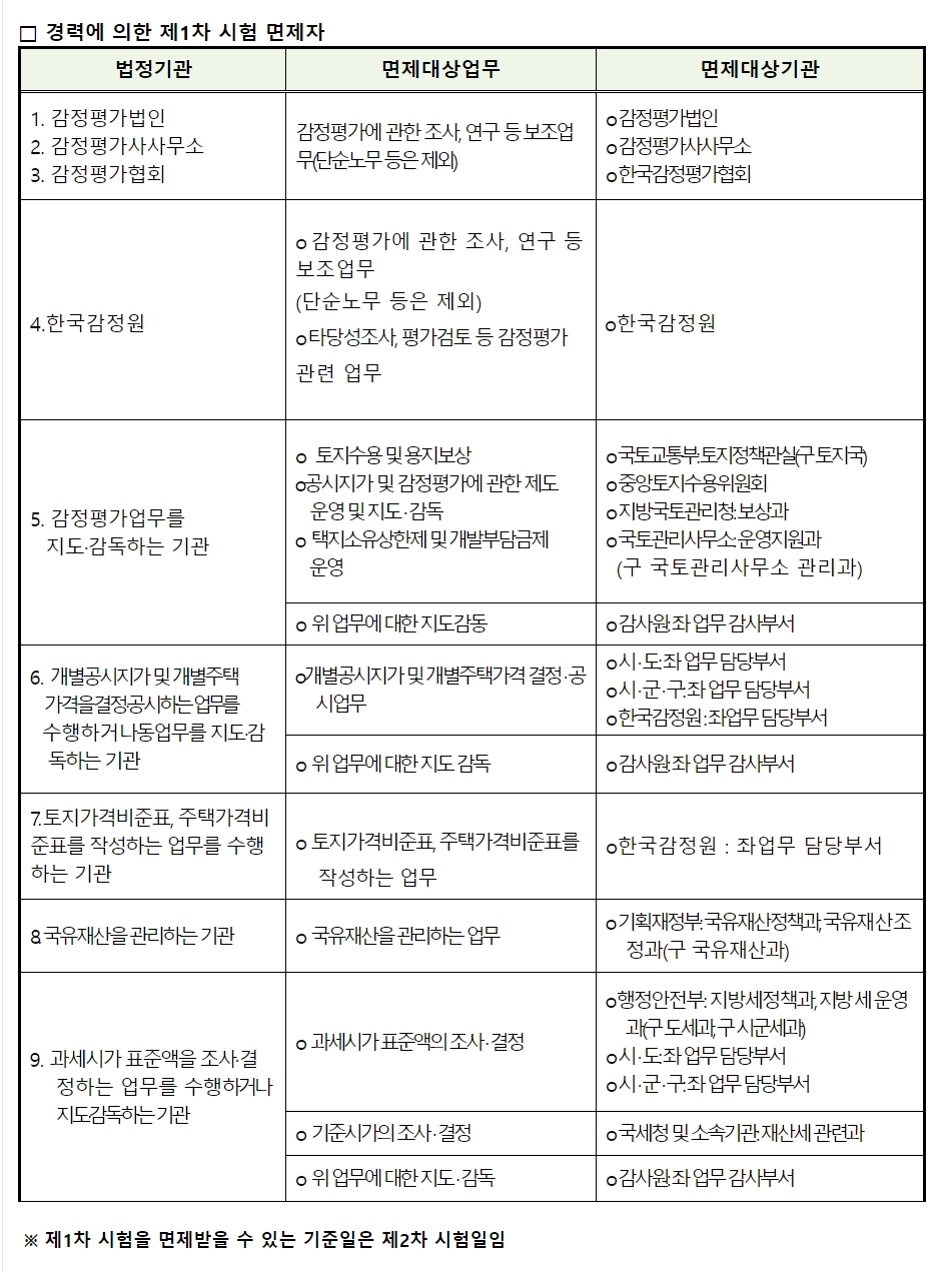 감정평가사 시험은 경력에 의하여 1차에 한하여 시험을 면제하는 주는데, 아래의 표를 참고하셔서 면제대상인지여부를 확인하시면 됩니다.
