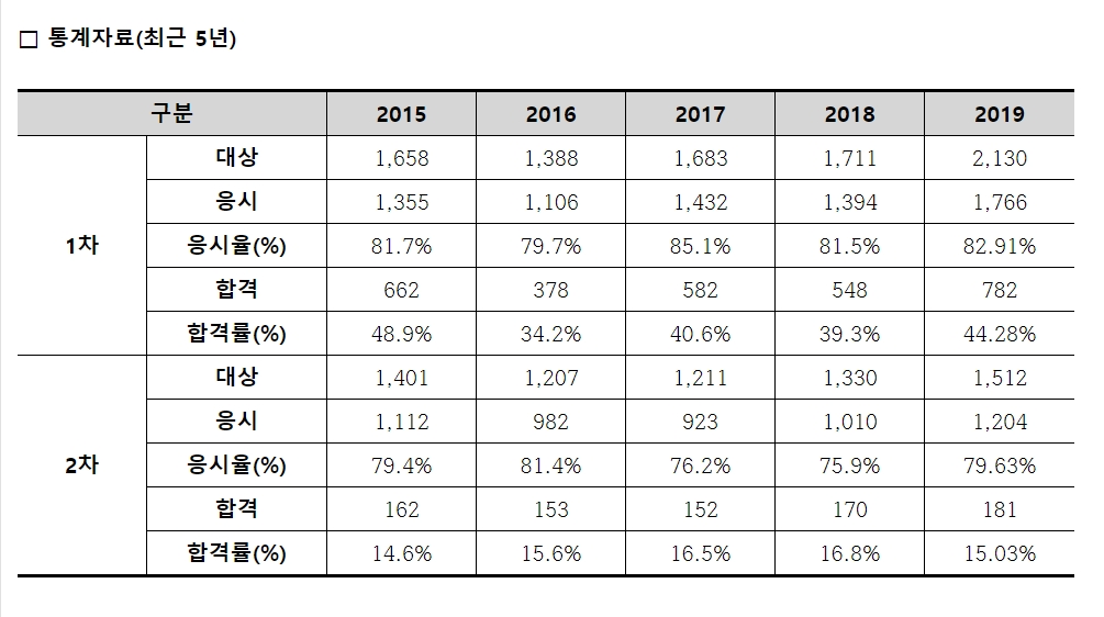 최근 5년간(15~19년) 감정평가사 시험 응시인원 및 합격자 인원, 응시율, 합격률입니다.