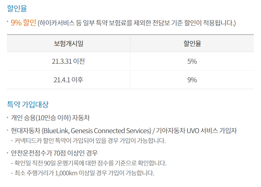 현대자동차(BlueLink, Genesis Connected Services) 기아자동차 UVO 서비스 가입자 중 안전운전 점수가 70점 이상인 경우 9% 특약할인 혜택입니다.