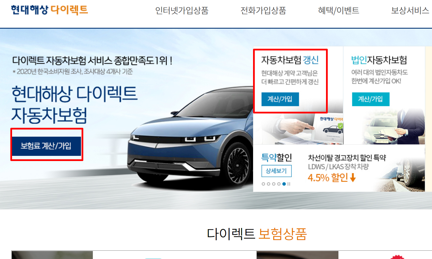 2. 현대해상 다이렉트 자동차보험 홈페이지에 접속을 하시면 화면 중간쯤 보시면 보험료 계산/가입, 자동차보험 갱신 계산/가입이 있습니다. 신규가입 시 전자, 갱신 가입 시 후자를 누르셔서 절차에 따라 가입을 진행하시면 됩니다.