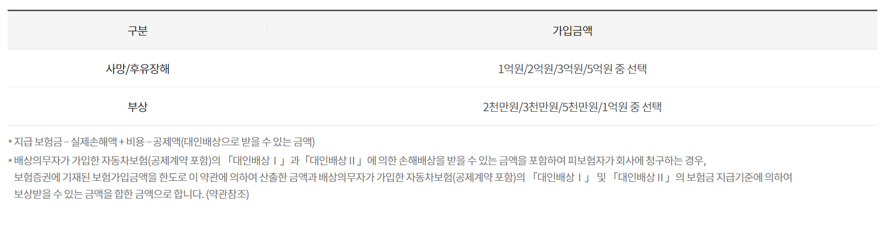 - 사고당 선택한 보험가입 금액 한도를 보상하며 반드시 가입해야 하는 의무보험입니다.