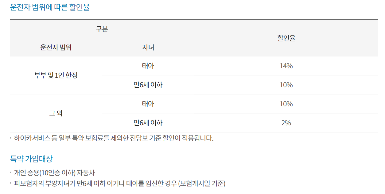 만 6세 이하 자녀가 있거나임 중이라면 2~14% 특약할인 혜택입니다.
