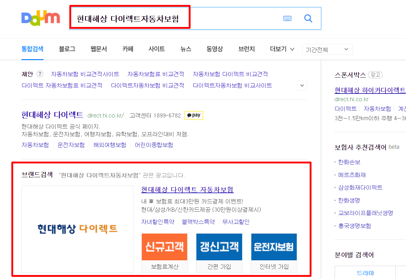 1. 다음(daum)검색창에 "현대해상 다이렉트 자동차보험"이라고 검색하셔서 현대해상 다이렉트 자동차보험 홈페이지에 접속을 합니다.