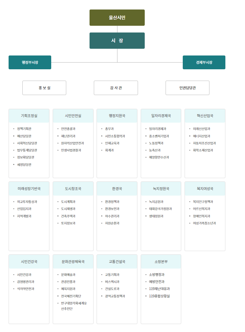안녕하세요. 주말에 장마가 끝난다고 예상을 하는데요. 올해 장마는 많은 비가 와서 피해가 많았다네요. 하루빨리 복구가 되었으면 좋겠습니다. 금일 시간에는 울산광역시 남구 중앙로에 위치한 울산시청 홈페이지 바로가기, 조직도에 대하여 알아보는 시간을 갖도록 하겠습니다. 울산시는 중구, 북구, 남구, 울주군, 동고의 5개의 구를 관할하고 있습니다. "더 큰 대한민국 우뚝한 울산"을 시정 목표로 세우고 있으며, 이를 위하여 "글로벌 융합 산업도시로 도약" "편리하고 안전한 선진도시 구현" "자연과 사라밍 공존하는 친환경 생태도시 건설" "미래지향적 도시공간 조성" "삶의 품격이 높고 매력이 넘치는 문화도시 조성"을 전략 목표로 추진하고 있습니다. 울산시청 홈페이지 바로가기, 조직도에 대하여 자세히 알아보겠습니다.