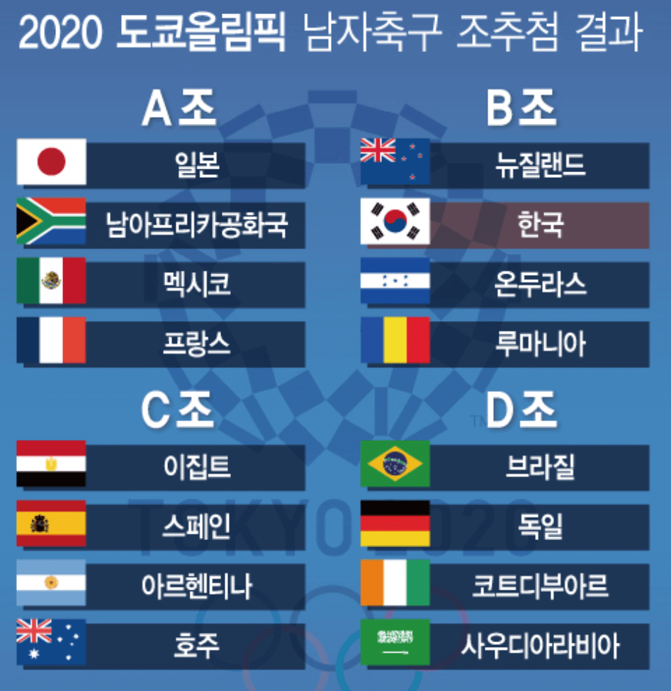도쿄올림픽 축구는 총 16개 국가가 그룹 A~D조로 구성하여 4개의 국가가 경기를 하여 각 조 1~2위가 다음 라운드에 진출해 8강전을 치르게 됩니다.