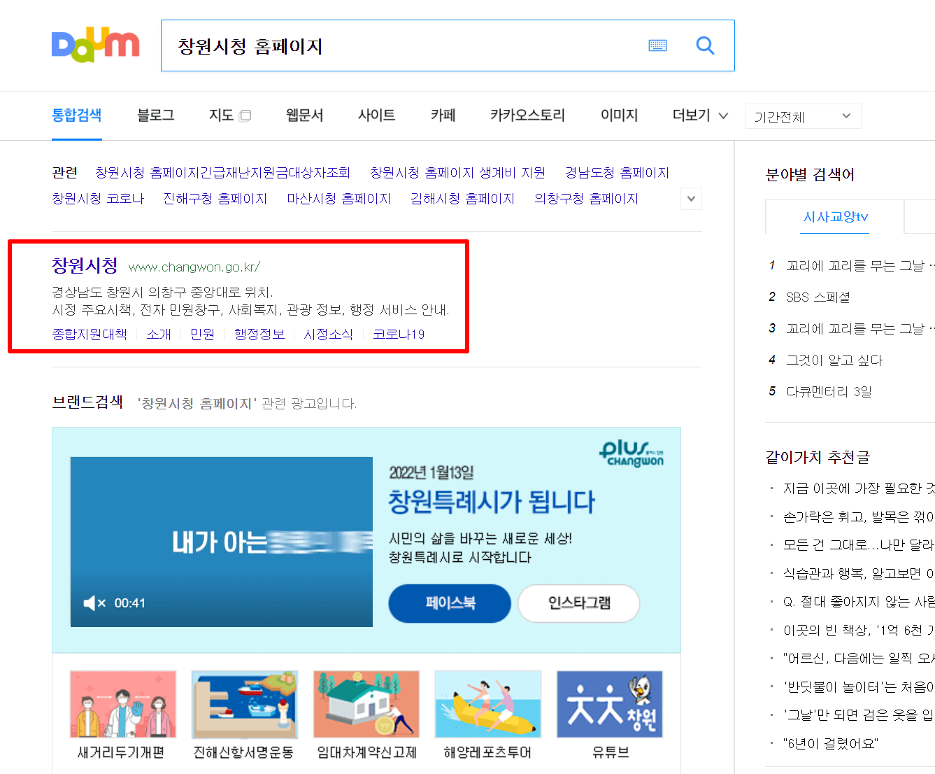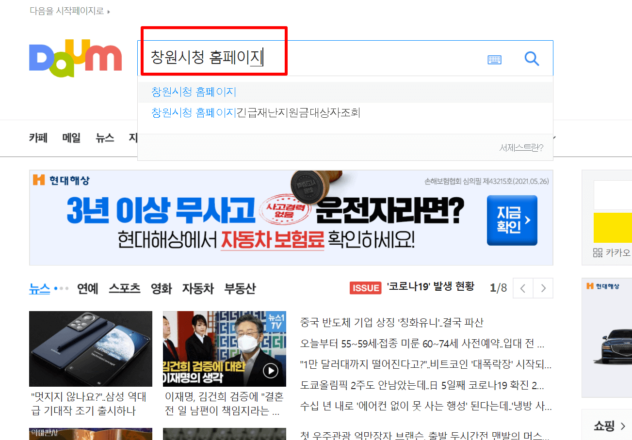 1. 다음(daum) 검색창에 "창원시청 홈페이지"라고 검색을 합니다.