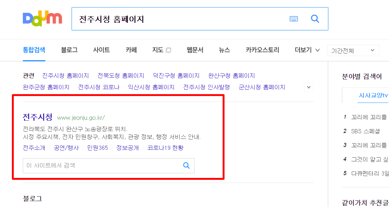 1. 다음(daum)검색창에 "전주시청 홈페이지"라고 검색을 합니다.