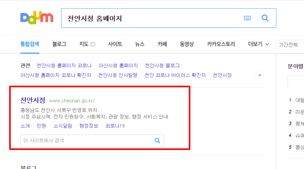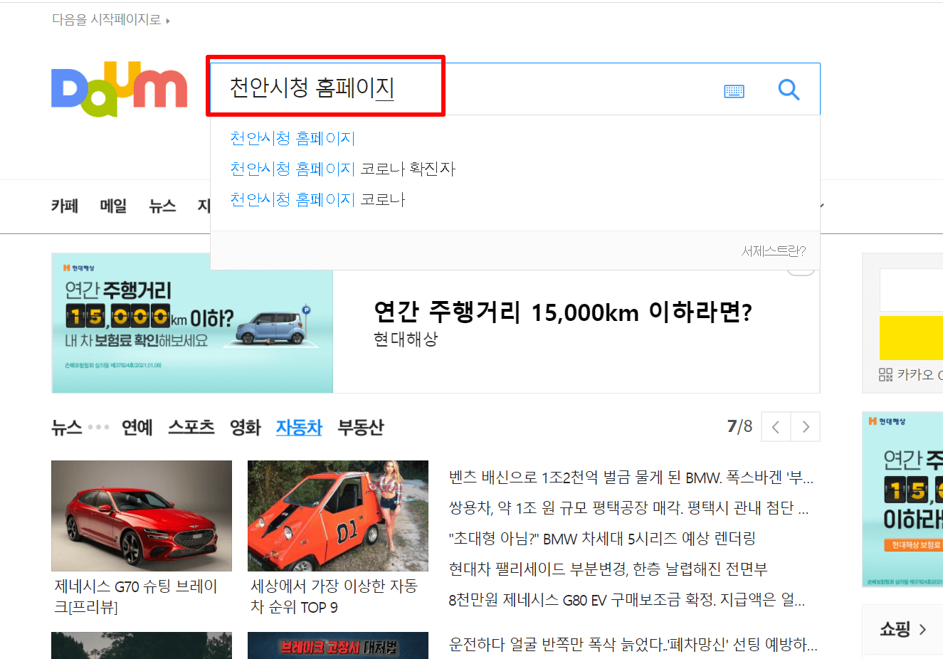 1. 다음(daum)검색창에 "천안시청 홈페이지"라고 검색을 합니다.