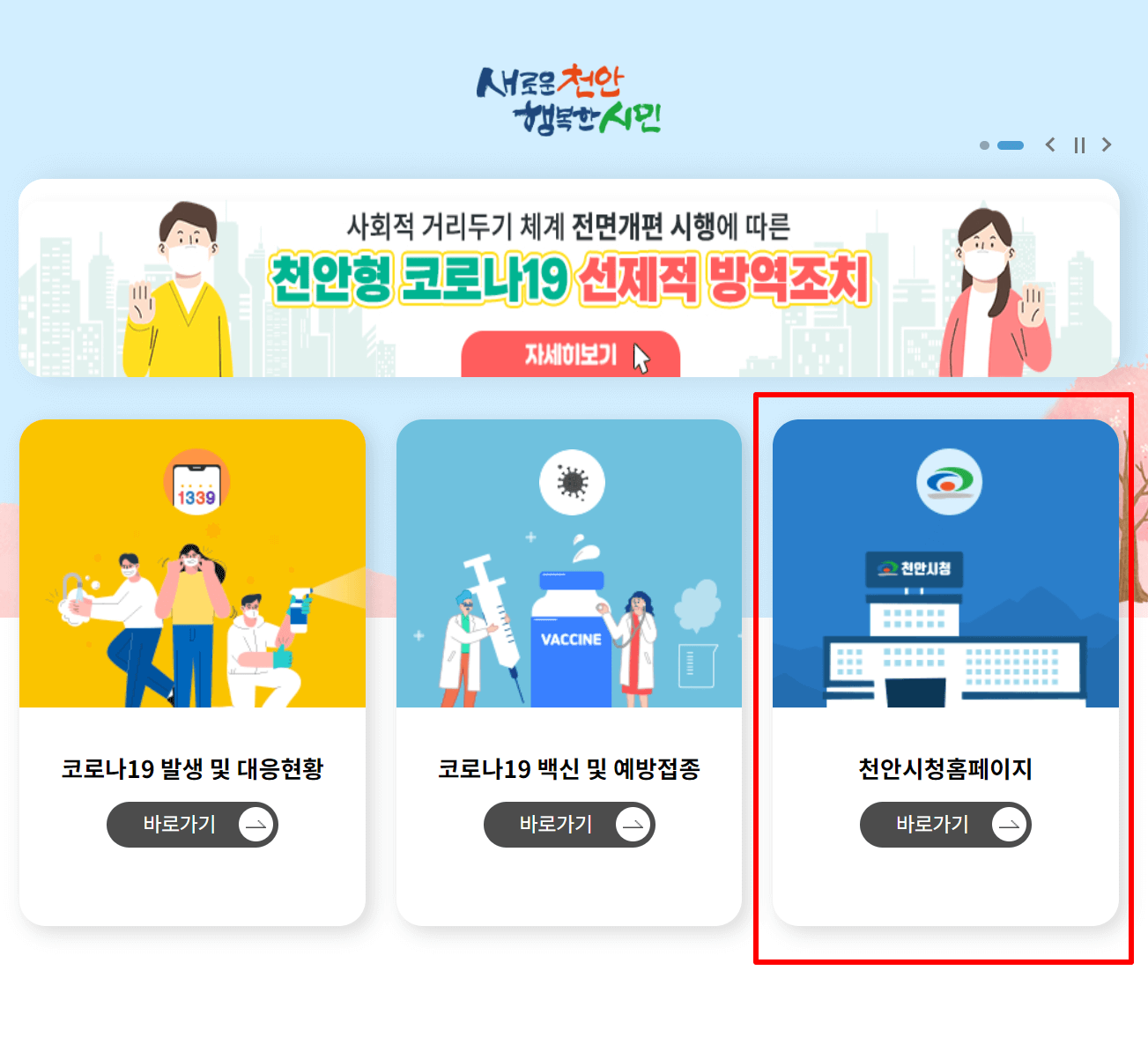 2. 천안시청 홈페이지에 들어가시면 "코로나19 발생 미 대응현황 바로가기" "코로나19 백신 및 예방 접종 바로가기" "천안시청 홈페이지 바로가기" 3개가 나옵니다. 천안시청 홈페이지 바로가기를 누르셔서 메인 홈페이지로 들어갑니다.