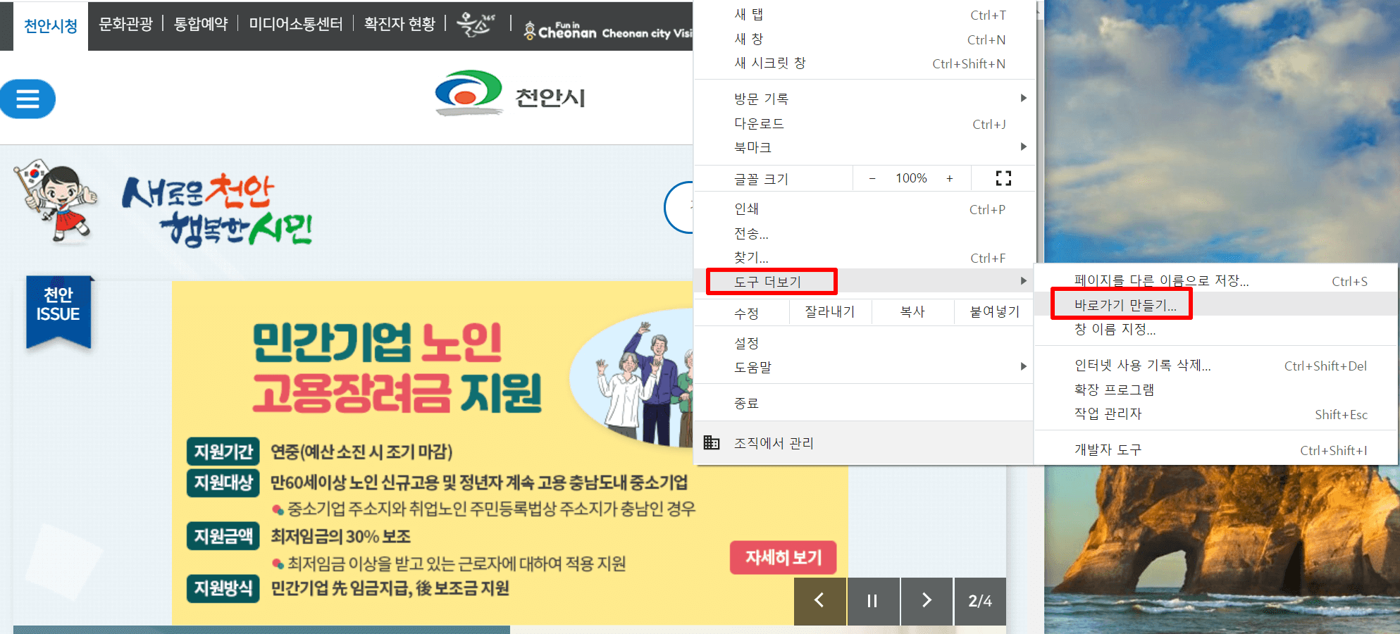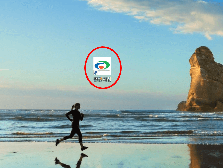 6. 바탕화면에 "천안시청" 아이콘이 생성이 됩니다. 천안시청 아이콘 누르시면 바로 홈페이지에 접속을 하실 수 있습니다. 그리고 시정 주요 시책, 전자 민원창구, 사회복지, 관광 정보, 행정 서비스를 이용하실 수 있습니다.