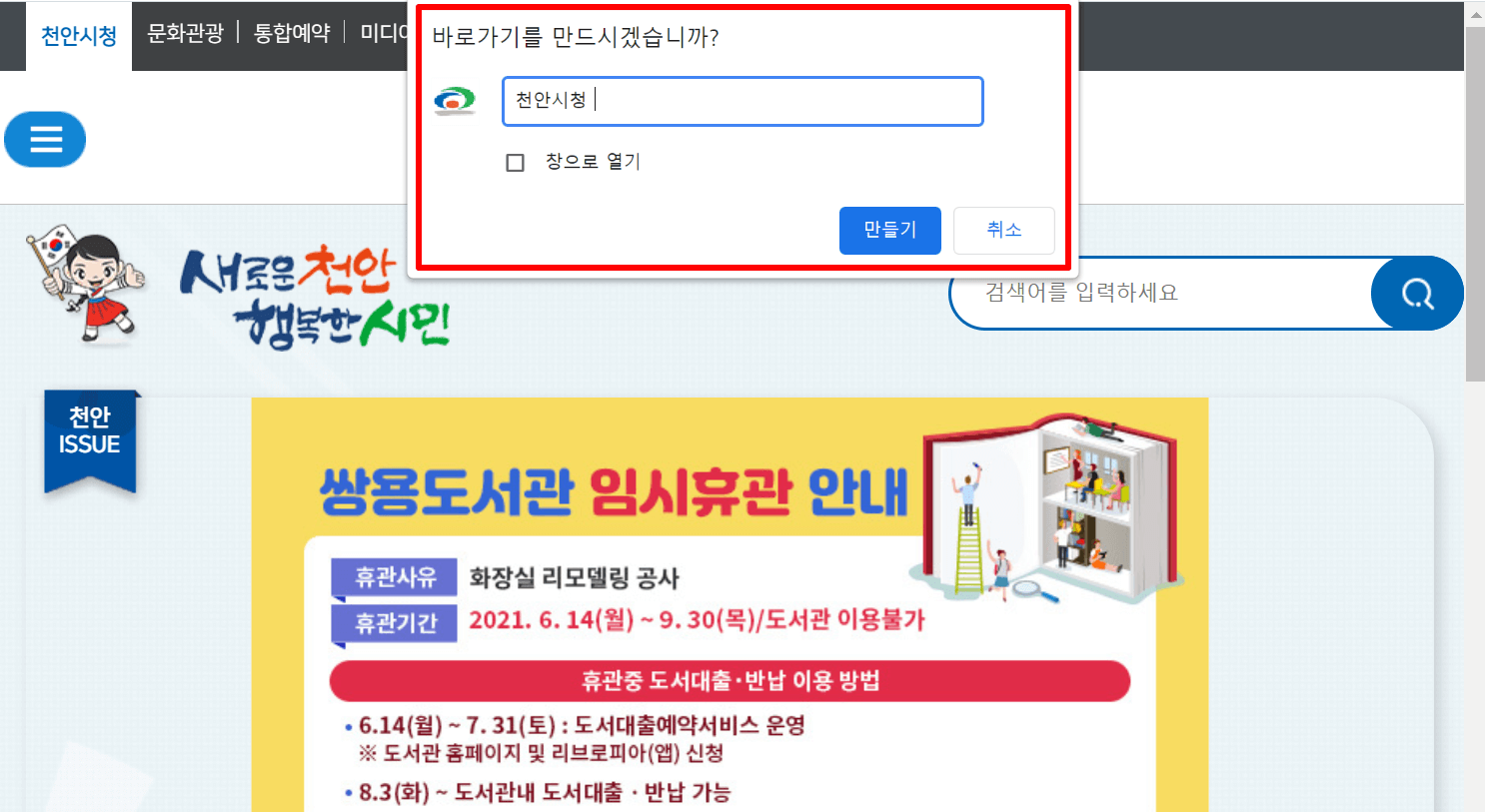 5. "바로가기를 만드시겠습니까" 라고 뜨면 원하시는 이름으로 적으시고, 만들기를 누릅니다.
