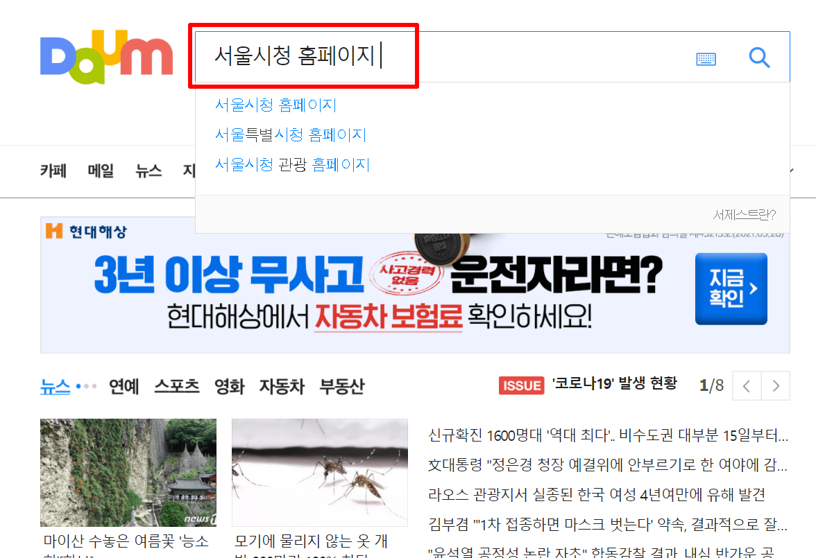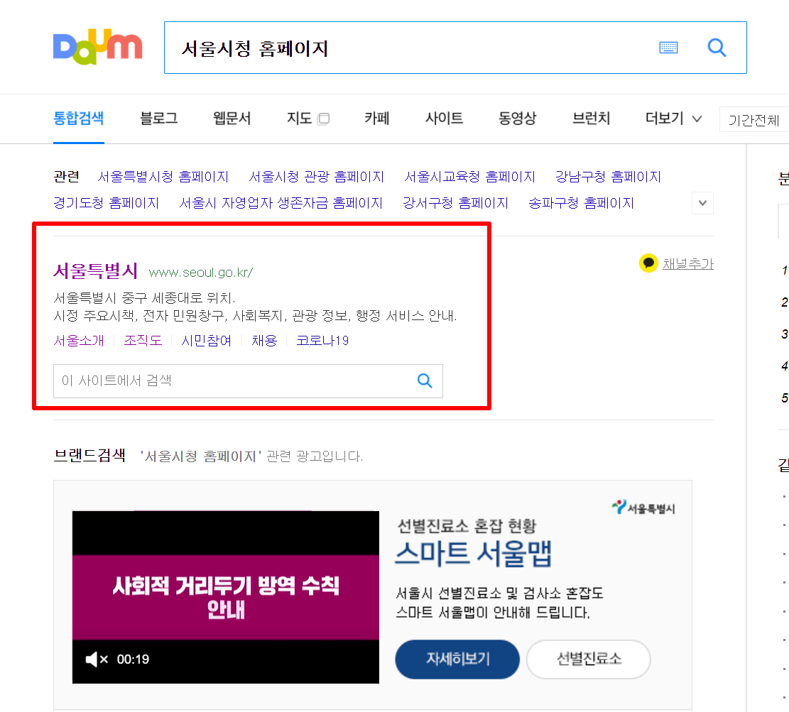 1. 다음(daum)검색창에 "서울시청 홈페이지"라고 검색을 합니다.