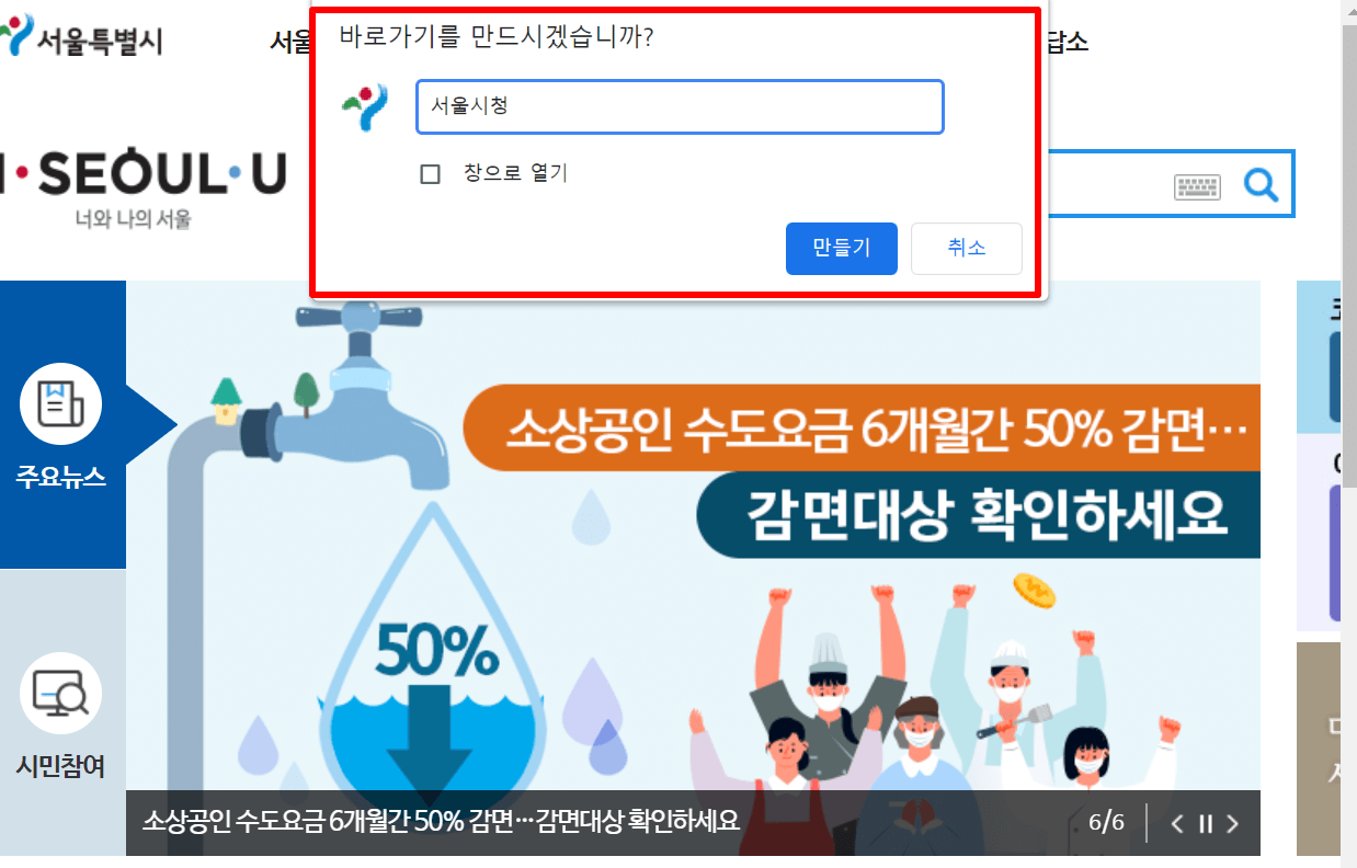 6. 바탕화면에 "서울시청" 홈페이지 아이콘이 생성이 됩니다. 서울시청 아이콘만 누르시면 서울시청 홈페이지에 바로 접속을 하실 수 있습니다. 서울시 시정 주요 시책, 전자 민원창구, 사회복지, 관광 정보, 행정 서비스 등을 빠르게 이용하 실 수 있습니다.