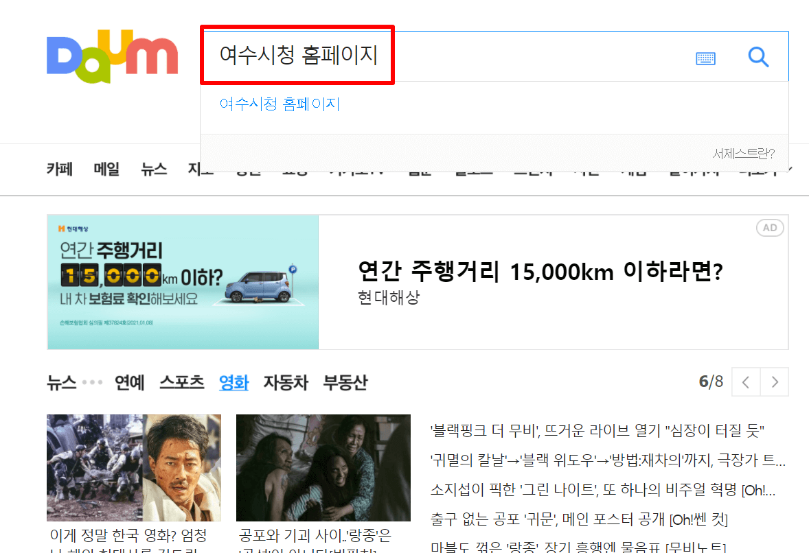 1. 다음(daum)검색창에 "여수시청 홈페이지"라고 검색을 합니다.