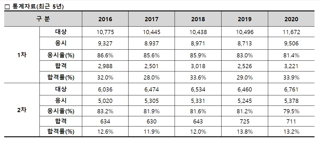 1차 시험 합격률 평균적으로 30% 초반, 2차 시험 합격률 평균적으로 10%대 초반입니다.