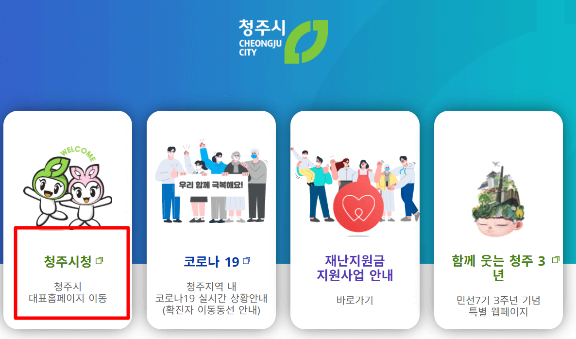 2. 청주시청 홈페이지에 접속을 하시면 "청주시청 대표 홈페이지 이동" "코로나19" "재난지원금 지원사업 안내" "함께 웃는 청주 3년" 4가지가 나옵니다. 첫 번째인 "청주시청 대표 홈페이지 이동"을 누르셔서 청주시청 홈페이지에 접속을 합니다.