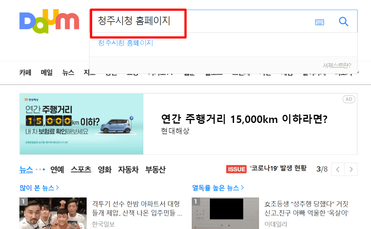 1. 다음(daum)검색창에 "청주시청 홈페이지"라고 검색을 합니다.