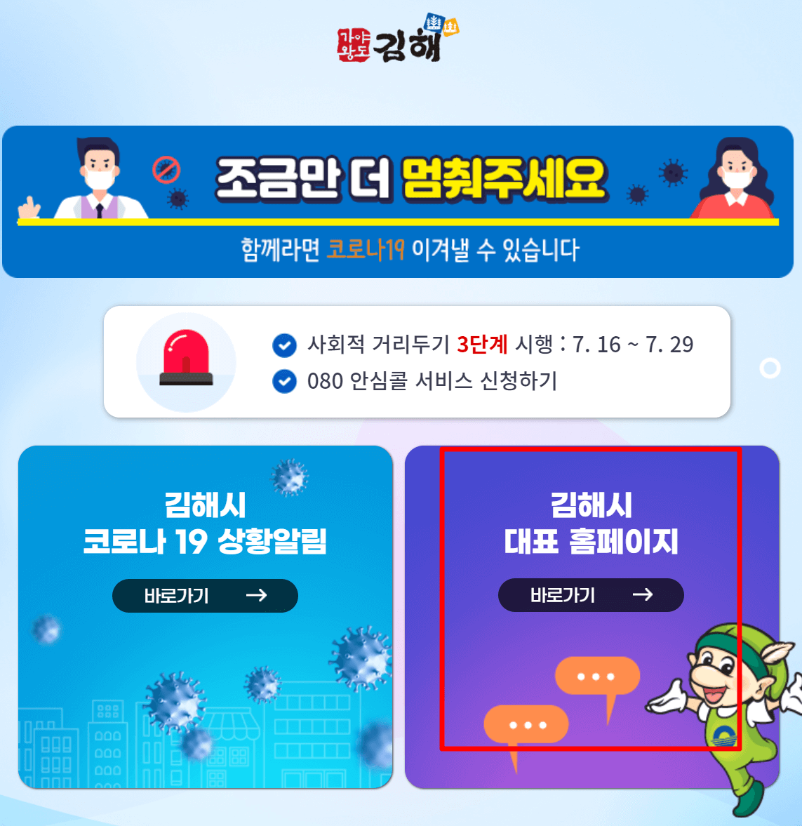 2. 김해시청 홈페이지에 들어가시면 "김해시 코로나19 상황 알림 바로가기" "김해시 대표 홈페이지 바로가기" 2가지가 나옵니다. 후자인 "김해시 대표 홈페이지 바로가기"를 누르셔서 김해시청 홈페이지에 접속을 합니다.