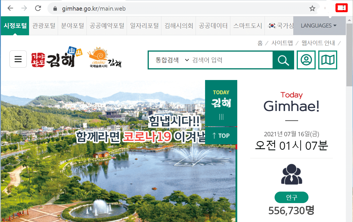 3. 김해시청 홈페이지에 접속을 하시면 오른쪽 상단에 보시면 "점 3개"를 누릅니다.