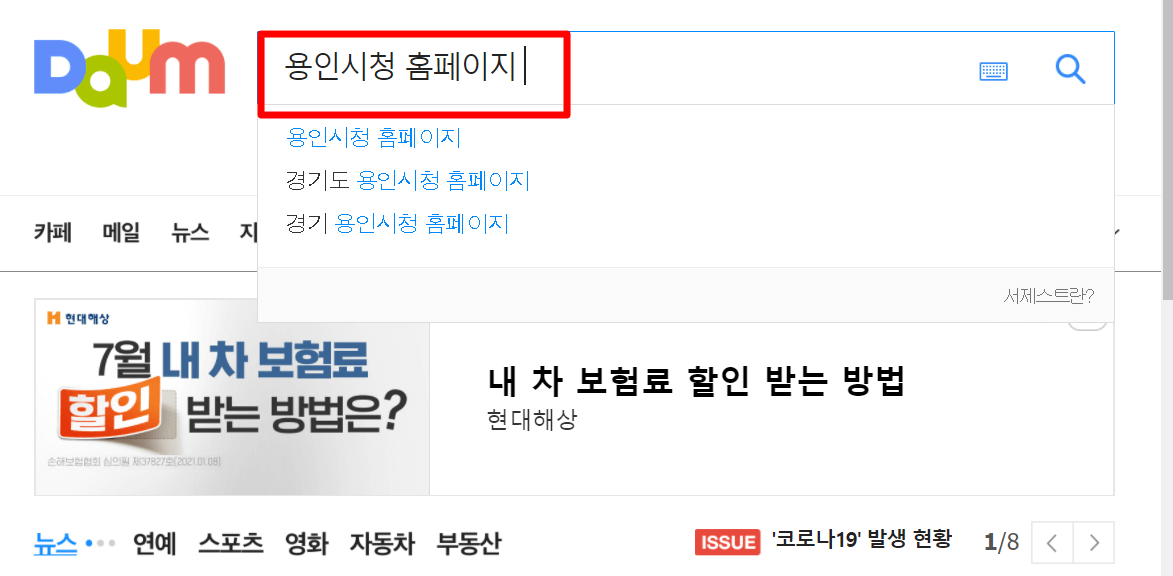 1. 다음(daum)검색창에 "용인시청 홈페이지"라고 검색을 합니다.