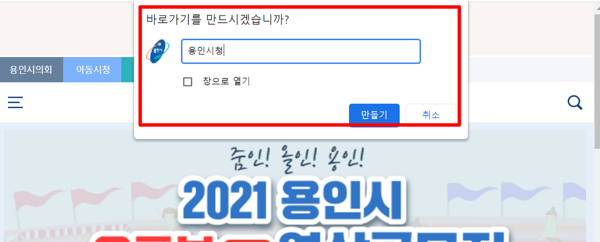 5. "바로가기를 만드시겠습니까" 라고 뜨면 원하시는 이름으로 적으시고, 만들기를 누릅니다.