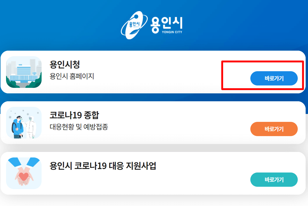 2. 용인시청 홈페이지에 접속을 하시면 "용인시청 홈페이지 바로가기" "코로나19 종합 대응현황 및 예방 접종 바로가기" "용인시 코로나19 대응 지원사업 바로가기" 3군데가 나옵니다. 첫 번째인 "용인시청 홈페이지 바로가기"를 누르셔서 용인시청 홈페이지에 접속을 합니다.
