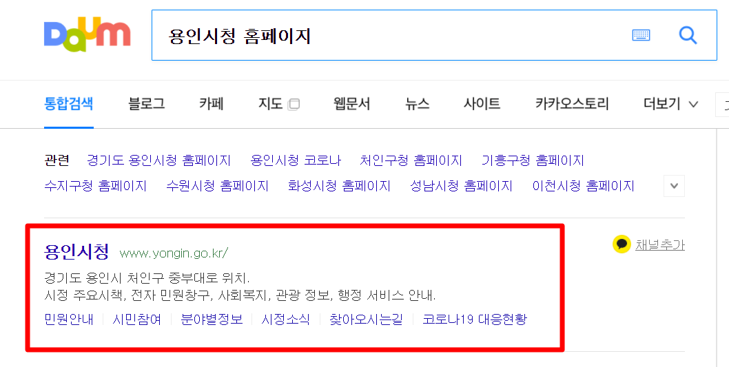 1. 다음(daum)검색창에 "용인시청 홈페이지"라고 검색을 합니다.