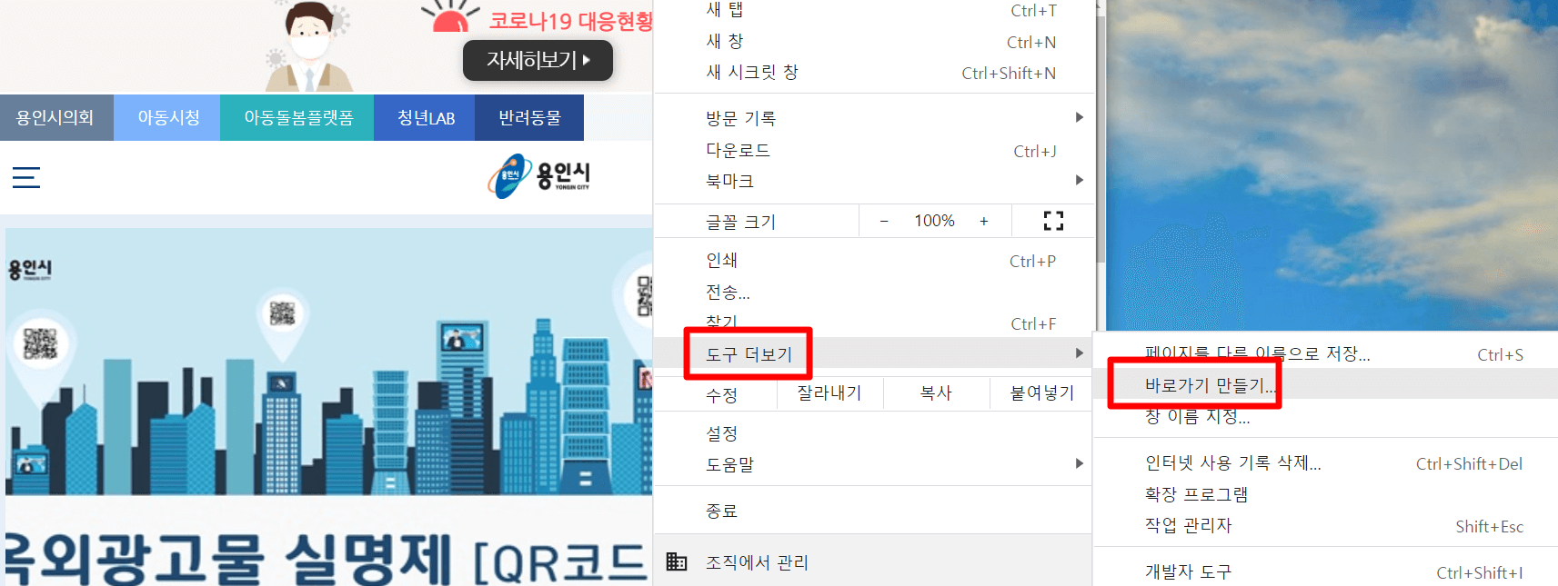 4. "도구 더보기" "바로가기 만들기"를 누릅니다.