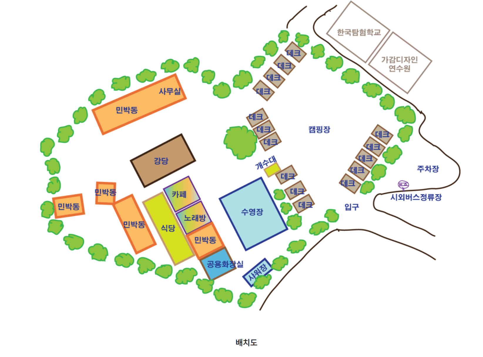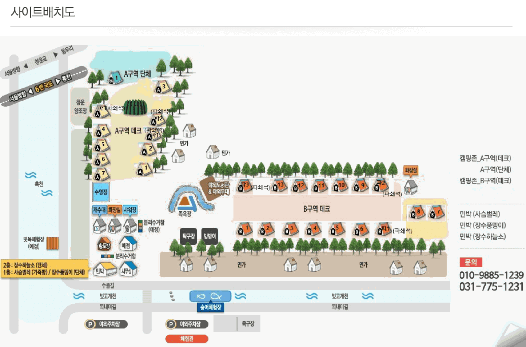 - 시설정보: 수세식 화장실, 샤워실, 개수대, 매점, 화로대 사용, 전기사용, 무선인터넷, 장작 판매, 온수 사용, 애완동물, 수영장, 낚시터