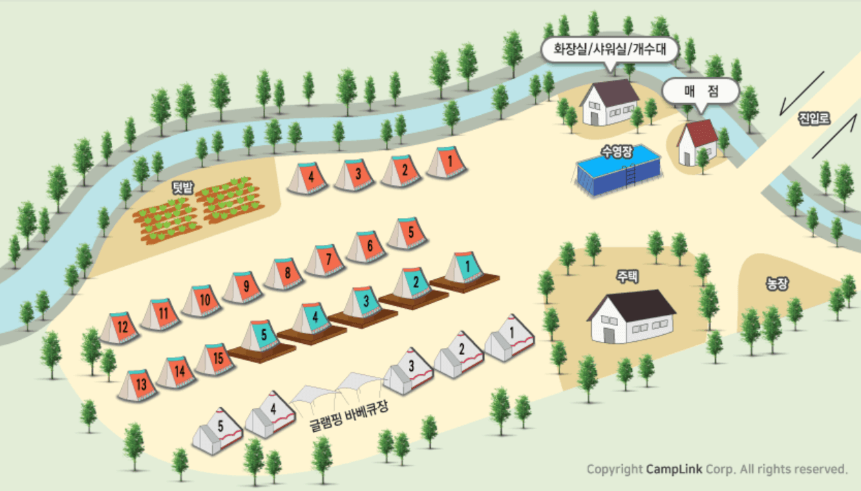 - 시설정보: 수세식 화장실, 샤워실, 개수대, 매점, 화로대 사용, 전기사용, 무선인터넷, 장작 판매, 온수 사용, 애완동물, 수영장, 낚시터
