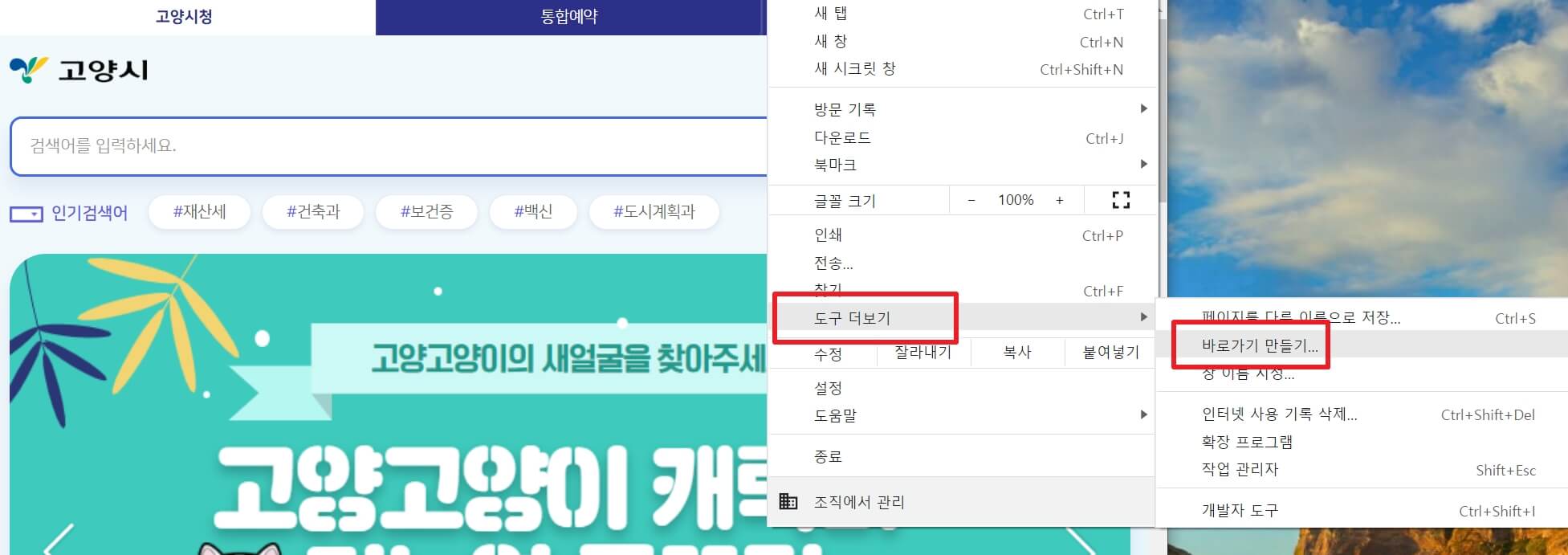 5. "도구 더보기" "바로가기 만들기"를 누릅니다.