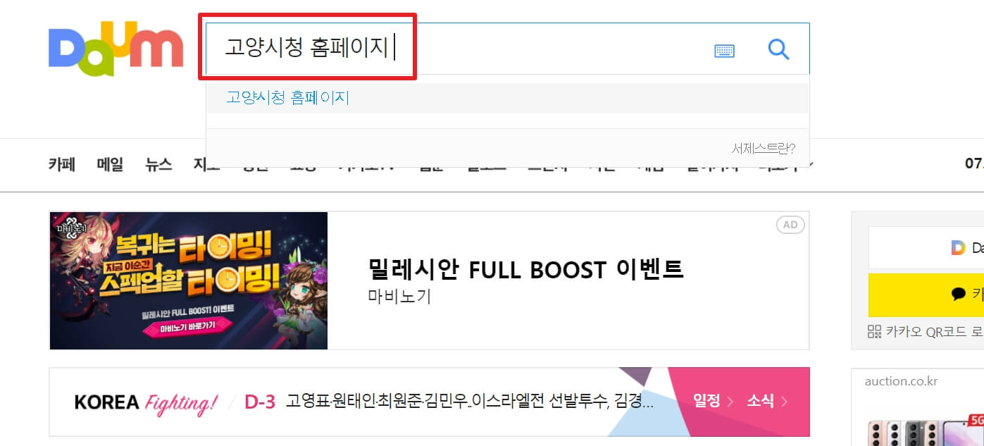 1. 다음(daum) 검색창에 "고양시청 홈페이지"라고 검색을 합니다.