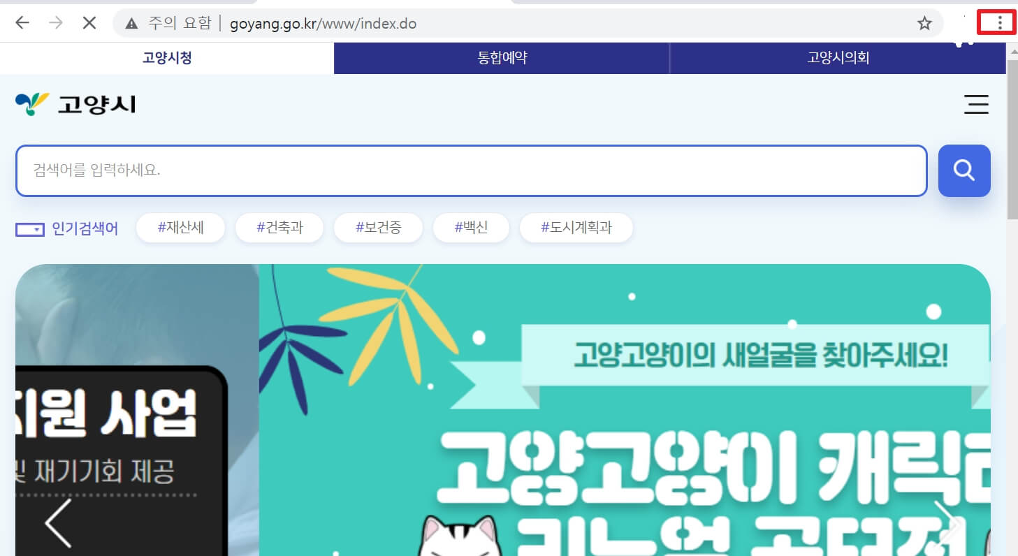 4. 고양시청 홈페이지에 들어가셔서 오른쪽 상단에 보시면 "점 3개"를 누릅니다.