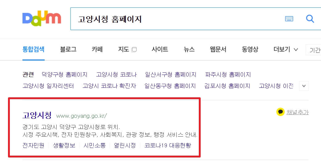1. 다음(daum) 검색창에 "고양시청 홈페이지"라고 검색을 합니다.