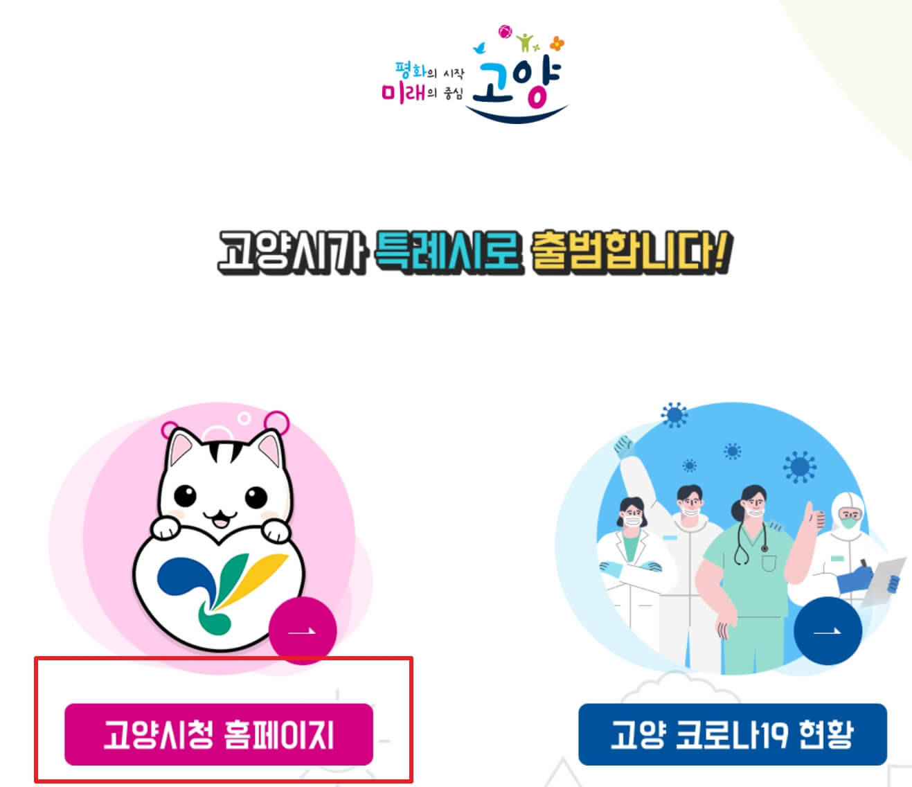 3. 고양시청을 누르셔서 접속을 하시면 고양시청 홈페이지에 바로 접속이 되지 않고, "수원시청 홈페이지 바로가기" "고양 코로나19 현황" 2개의 바로가기가 나옵니다. 여기서 첫 번째인 "고양시청 홈페이지 바로가기"를 누르셔서 들어갑니다.