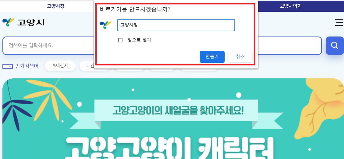 7. 바탕화면에 고양시청 아이콘이 생성이 됩니다. 고양시청 아이콘만 누르시면 고양시청 홈페이지에 바로 접속을 하실 수 있습니다. 그리고 고양시청 시정 주요 시책, 전자 민원창구, 사회복지, 관광 정보, 행정 서비스 등을 이용하실 수 있습니다.