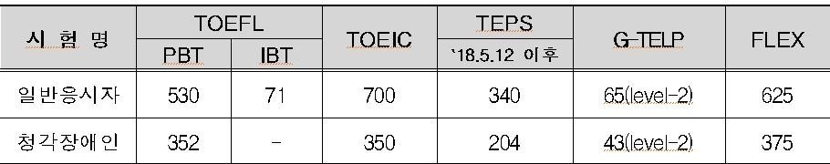 ○ 해당 외국어 시험기관의 정기시험 성적만 인정하고, 정부기관. 민간회사. 학교 등에서 승진. 연수. 입사. 입학. 졸업 등의 특정 목적으로 실시하는 수시 또는 특별시험은 인정 하지 않는다.
