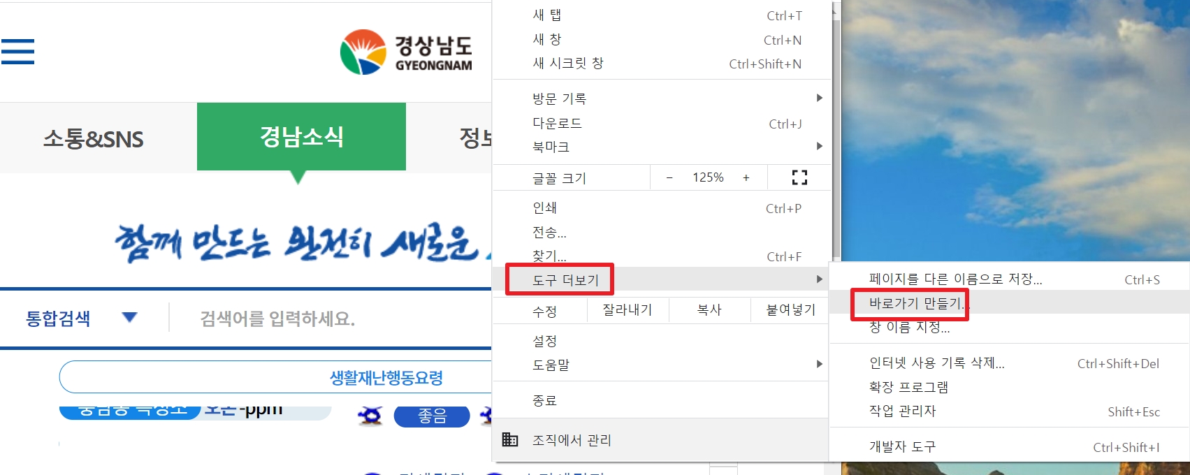 5. "도구 더보기" "바로가기 만들기"를 누릅니다.