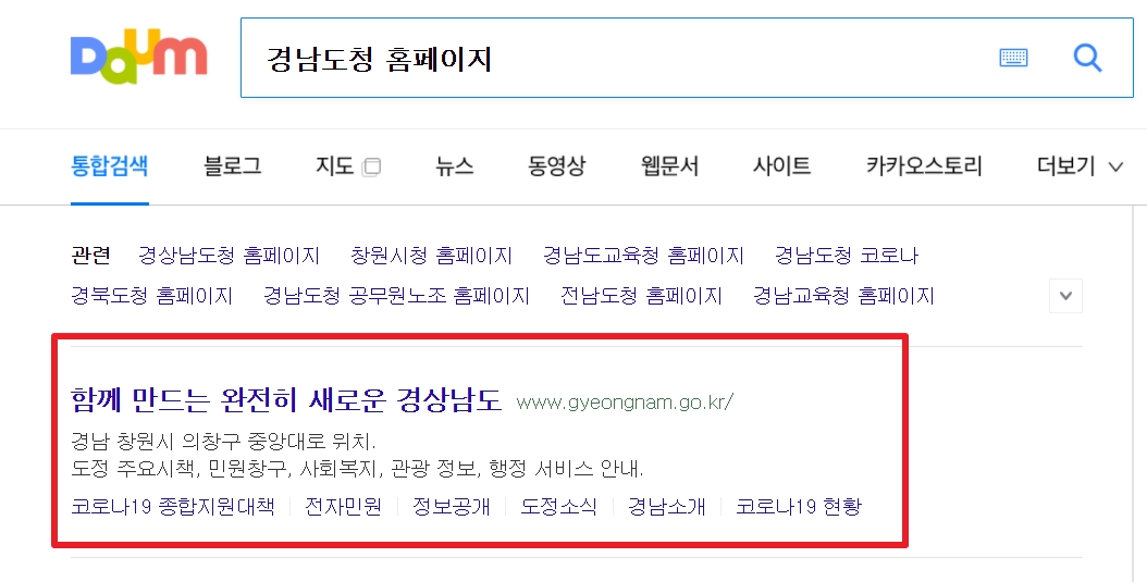 1. 다음(daum) 검색창에 "경남도청 홈페이지"라고 검색을 합니다.
