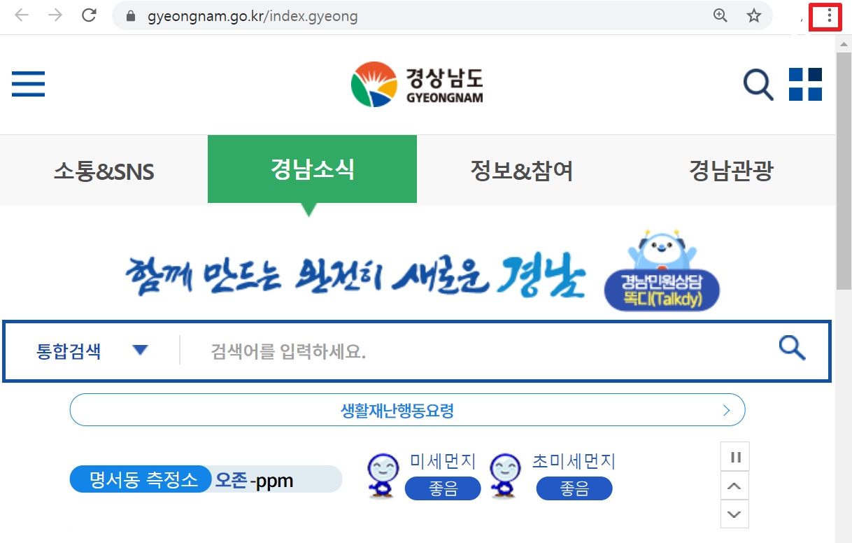 4. 경남도청 홈페이지에 들어가셔서 오른쪽 상단에 보시면 "점 3개"를 누릅니다.