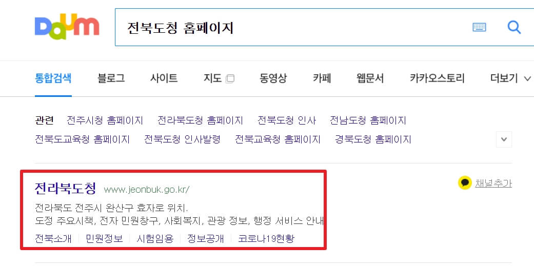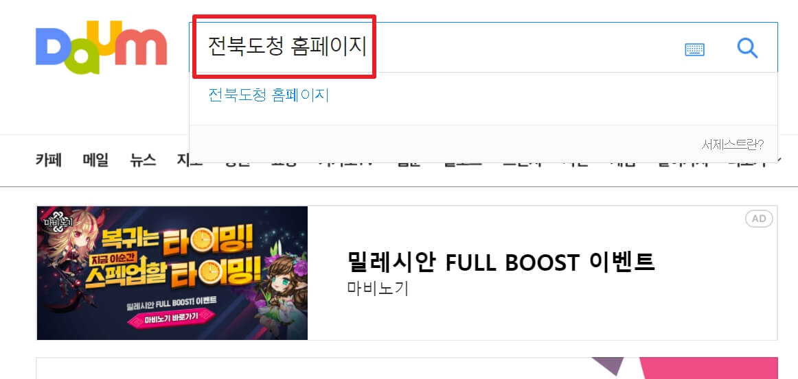 1. 다음(daum) 검색창에 "전북도청 홈페이지"라고 검색을 합니다.