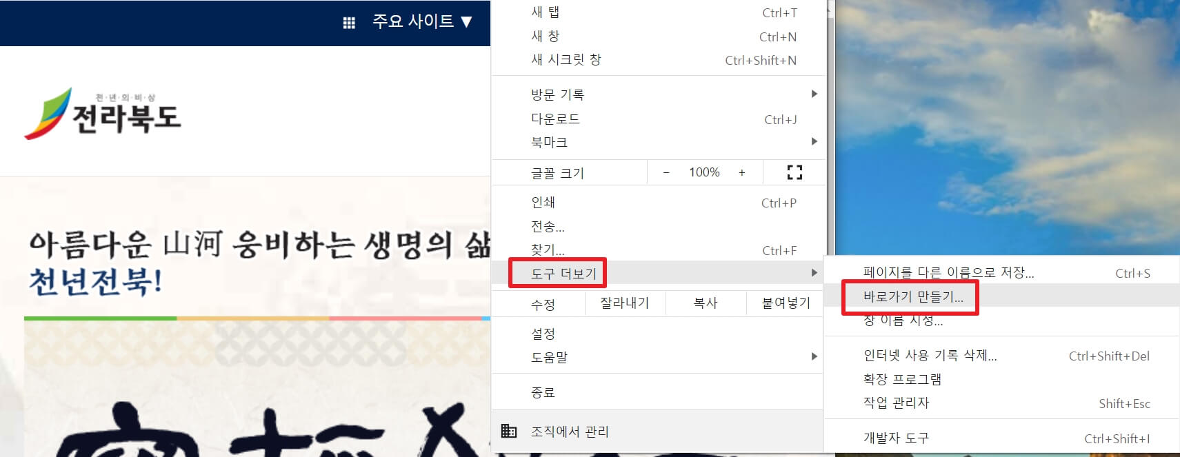 5. "도구 더보기" "바로가기 만들기"를 누릅니다.