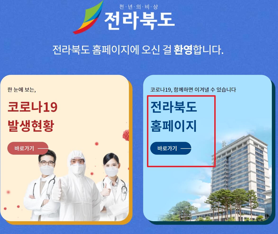 3. 전북도청을 누르셔서 접속을 하시면 전북도청 홈페이지에 바로 접속이 되지 않고, "코로나19 발생현황 바로가기" "전라북도 홈페이지 바로가기" 2개가 나옵니다. 후자인 "전라북도 홈페이지 바로가기"를 누르셔서 홈페이지에 접속을 합니다.